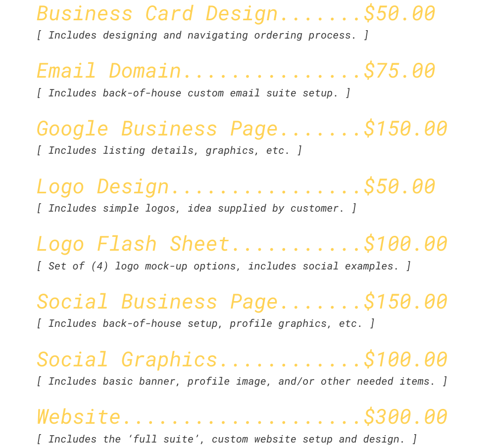Please note, pricing listed here DOES NOT include separate, third-party costs. (monthly service charges, web hosting fees, registration fees, etc.)